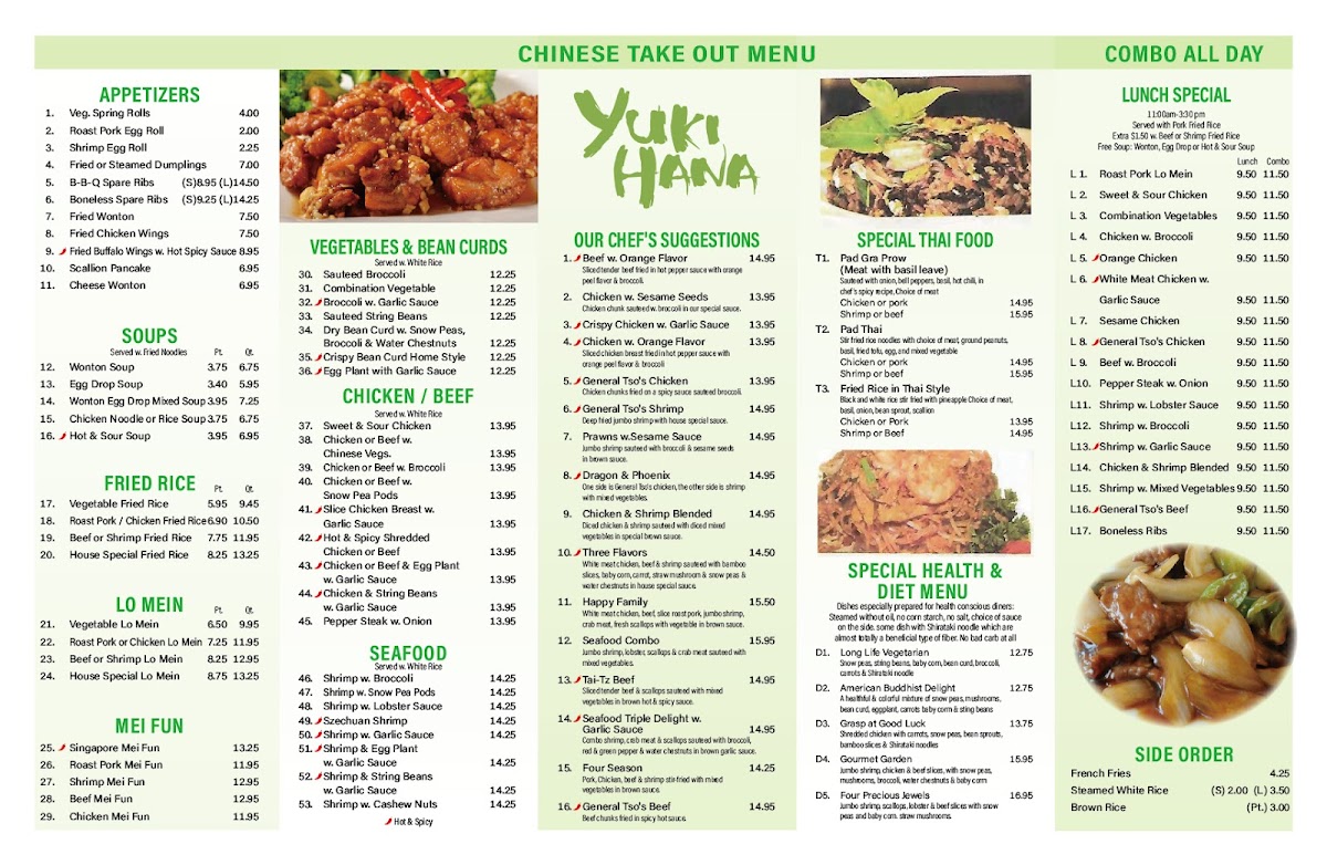Shrimp with mixed vegetables. Choice of pork, beef, or shrimp fried rice. Select from wonton, egg drop, or hot & sour soup.
